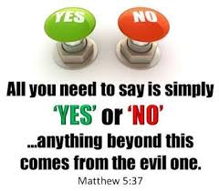 Jesus says that all such reasoning is hog wash. God witnesses every promise you make and no special wording can make it either more, or less, binding. Jesus says, quit playing games and keep all of your promises. There are no loopholes because God is present in every area of life, and witnesses every word we say. Therefore, Jesus concludes, “Do not swear at all, but let your ‘Yes, mean Yes and your No, mean No’; anything more than this comes from the evil one.” (verse 37)