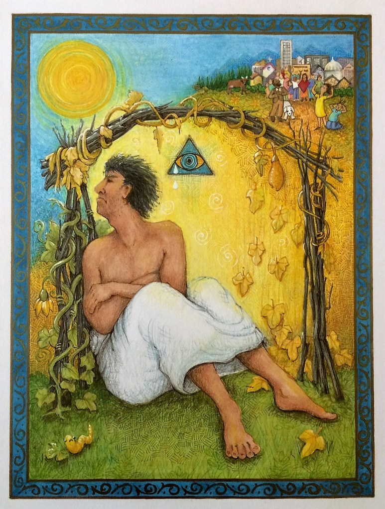 Jane Rowland, an artist, theologian and Anglican priest living in Alberta Canada has created a wonderful illustration of Jonah chapters 3 & 4, entitled “Under the Gourd Vine.” Let’s look at this picture and use it to dig deeper into Jonah’s story and to discover something about God’s mercy. We will work our way in from the edges as we examine the drawing.