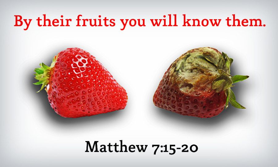 The fruit Jesus is describing is Christlikeness or what Paul later termed ‘the fruit of the Spirit.’ Whenever we see in a teacher the meekness and gentleness of Christ, his love, patience, kindness, goodness and self-control, we have reason to believe him to be true, not false. On the other hand, whenever these qualities are missing, and the ‘the works of the flesh’ are more apparent than the ‘fruit of the Spirit’—especially self-indulgence, we have reason to believe him to be false.” (Stott, p. 201